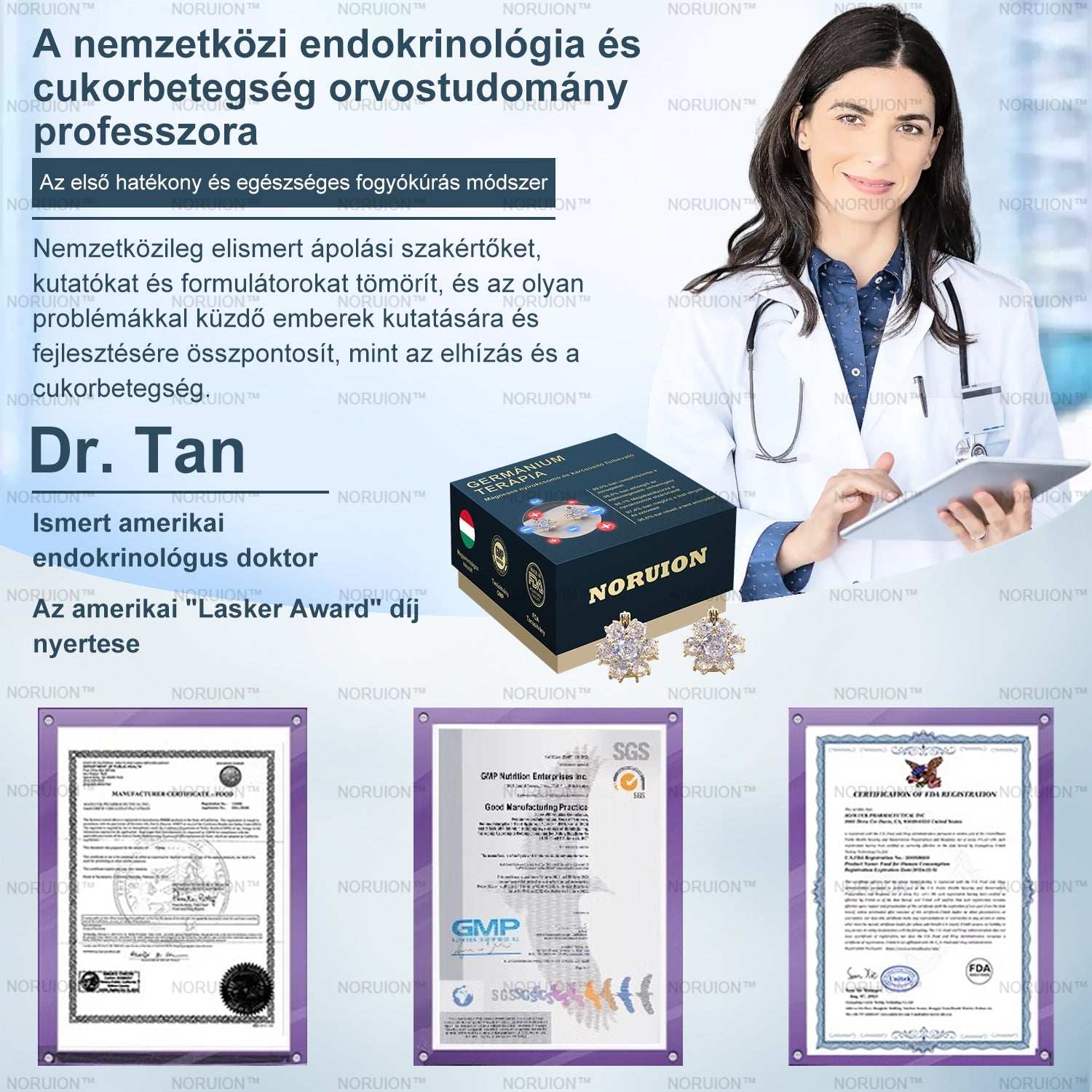 „Számos év kutatási tapasztalattal rendelkezem a táplálkozás és egészség területén, különös figyelmet fordítva a természetes terápiák és nyomelemek hatásaira az emberi testre. A legújabb tanulmányok azt mutatják, hogy a mágneses terápia képes stimulálni a fülcimpa akupunktúrás pontjait, elősegítve a vérkeringést és felgyorsítva a zsírégetést. Ezzel egyidejűleg a titán, amely kiváló biokompatibilitásáról ismert, szabályozza a test elektromos áramlását, segítve a vércukorszint fenntartását. A germanium, amely negatív ionokat bocsát ki, semlegesíti a pozitív töltéseket a testben, és serkenti a kollagén növekedését a bőrszövetekben. E kutatási eredmények alapján fejlesztettük ki az innovatív fogyókúrás termékünket: a NORUION™ Nyirokcsatorna Mágneses Fülbevaló.